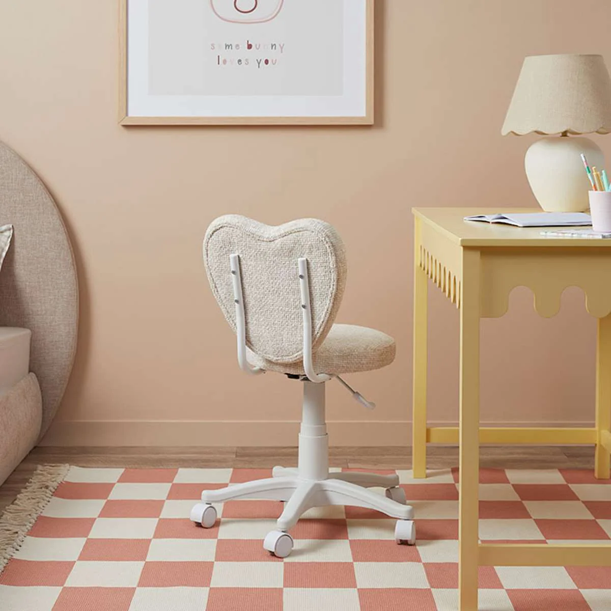 Add a touch of fun to your workspace with the Amour Desk Chair in cream. Featuring a height-adjustable design, sturdy castor wheels, and a textured cream fabric, this chair pairs comfort with modern style. The heart-shaped back and round seat make it perfect for study areas, inspiring creativity and brightening any room with its cheerful design.
