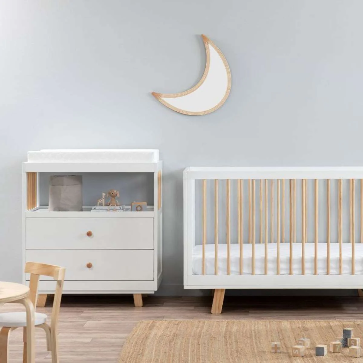 Storage is essential when you have a baby, which is why any parent will love the Aspen Change Table with Drawers - White/Natural. With a large open shelf and two spacious drawers, this modern change table makes the most of limited space by incorporating storage options. No need to reach far for fresh nappies or wipes, simply pop the essentials in the shelf and drawers and have everything within easy reach. The top tray is wide and spacious, so your baby feels comfortable and protected. A changing table with a changing mat tray can help parents make the everyday routine of changing nappies run smoothly. That way you have more time to concentrate on important things - like getting more smiles, snuggles, and giggles from bubs. This on-trend changing table features a two-toned design in white and natural for a chic and modern change table that will easily match to other decor in your nursery. Perfectly paired with our popular Aspen Cot - White/Natural, if you love this look, set up your dream nursery from the rest of the Aspen collection. Create a modern changing station with plenty of storage using the Aspen Change Table with Drawers.