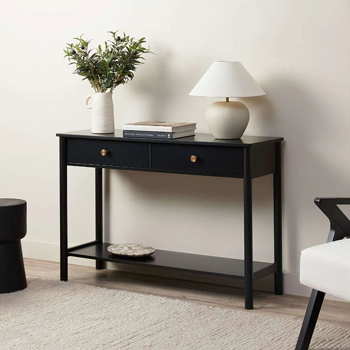 Upgrade your home with the Delaney Console Table - Black. Made from MDF with sturdy pine wood legs, it features two drawers with gold round knobs for a provincial farmhouse feel. Perfect for the hallway, living room, or bedroom with its classic style and matte paint finish.