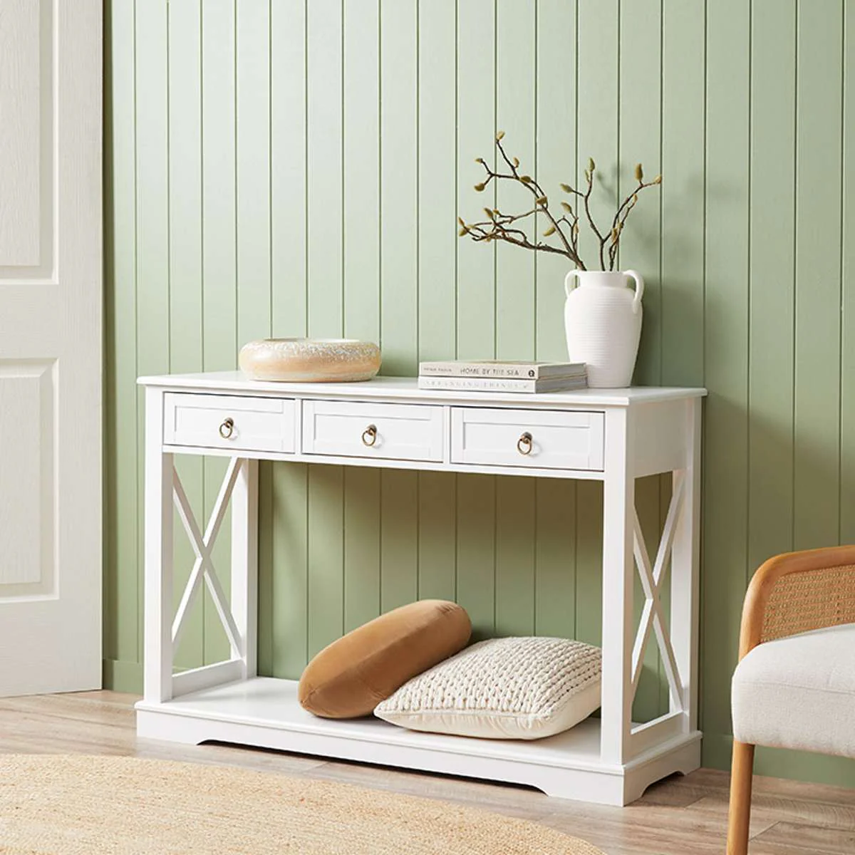 Create a Hamptons-inspired entryway with the Hamptons Console Table. This hall table looks stunning when placed in an entryway, hallway or living space and will provide an elegant welcome to your home. Featuring three sliding drawers, a spacious surface and bottom shelf, you have multiple storage and display options for the home. The statement cross side panels and metal ring drawer handles really give this entryway table the elegant Hamptons style. Finished in a simple white, this console table is classic and sophisticated, yet still has a fresh, relaxed style reminiscent of coastal places.