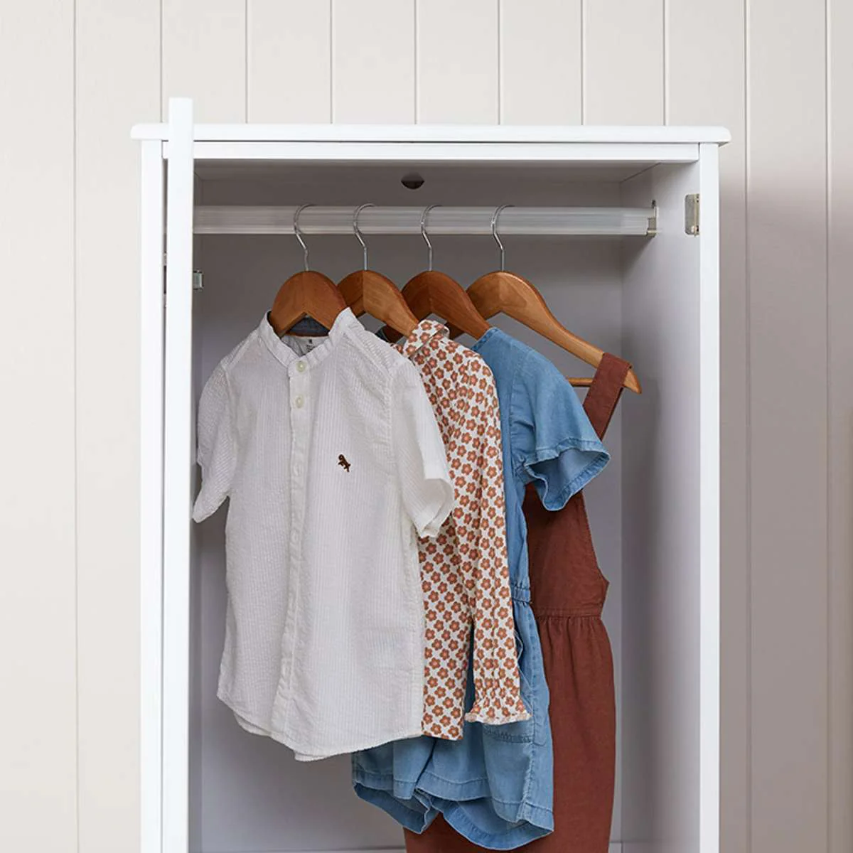 Embrace the elegance of the Hamptons with classic VJ panel detailing and a refined metal ring handle. This wardrobe adds a sophisticated touch to any child’s room, ensuring timeless appeal.
