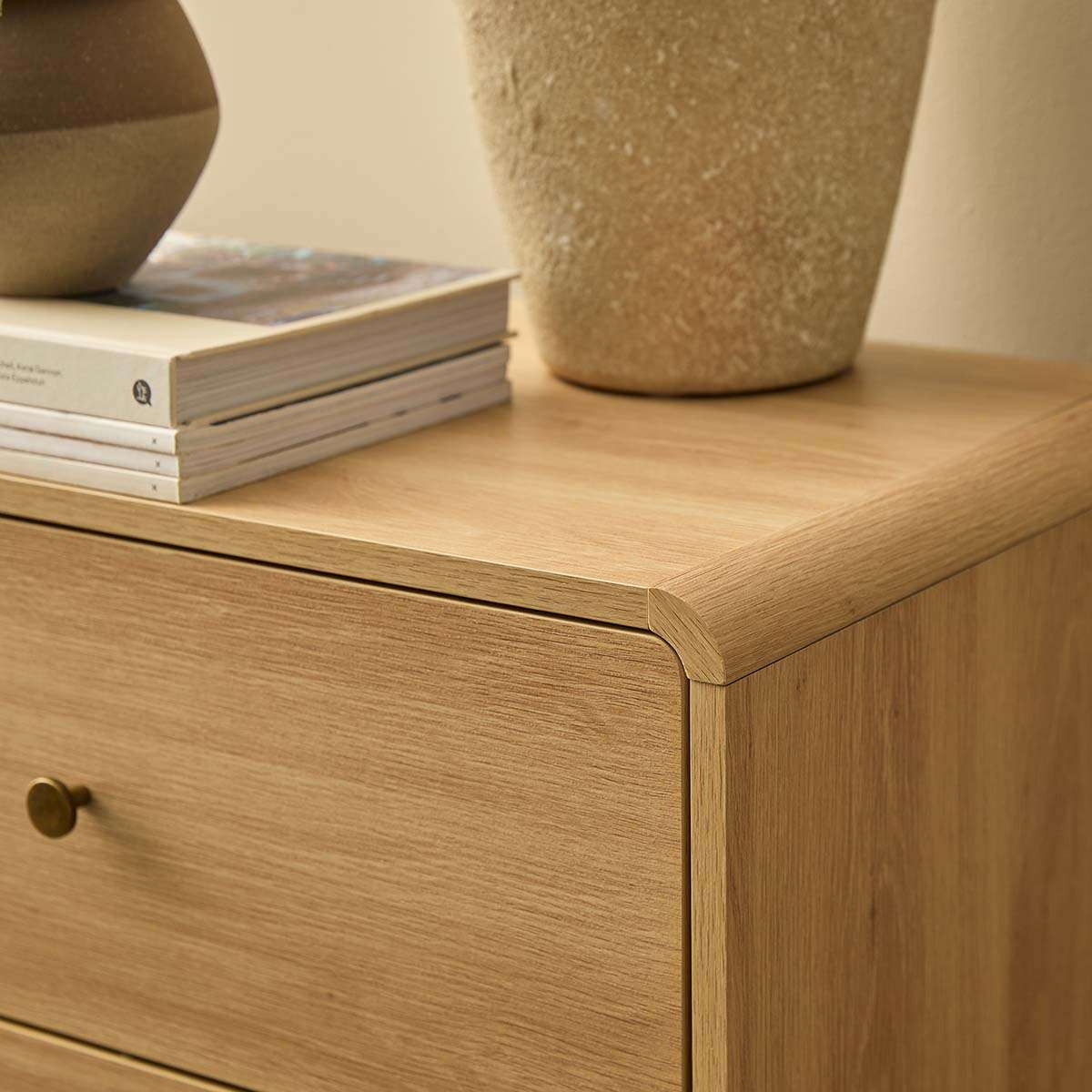 Inspired by farmhouse interiors, the natural wood-look finish and curved edges bring a warm, elegant feel to any space. Brushed brass knobs add a subtle, classic touch to the piece.