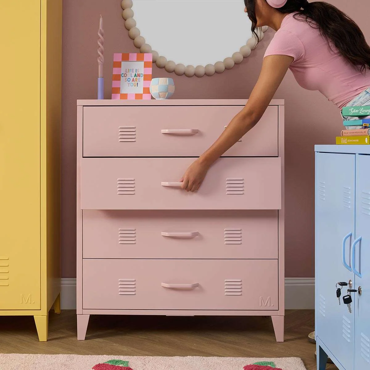 Add a pop of colour and functional storage to your bedroom with the Mocka Original Four Drawer in pink. With a powder-coated metal finish, smooth metal runners, and spacious drawers, it’s perfect for clothes, accessories, or essentials. At the ideal height for a mirror above, it’s a stylish and practical choice for any modern space.
