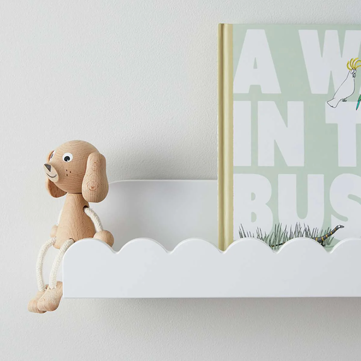 The Sarah Scalloped Wall Shelf in fresh white adds charm and function to nurseries or kids' bedrooms. The delightful scallop trim brings a playful touch, perfect for displaying books and keepsakes.