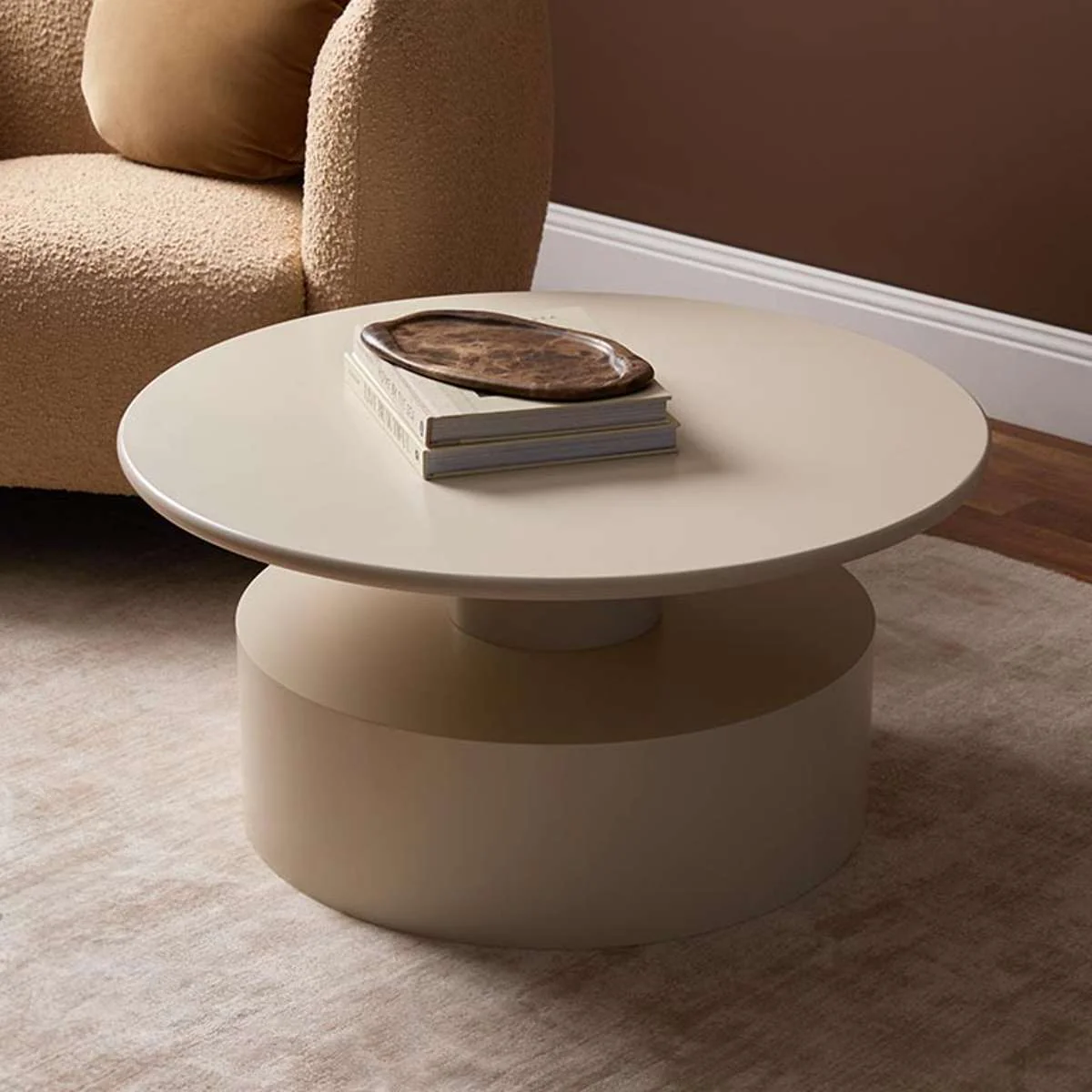 The Zayne Coffee Table's mid-century look with a soft beige finish adds timeless style to your space. Its round top and chunky base make it a standout centrepiece.